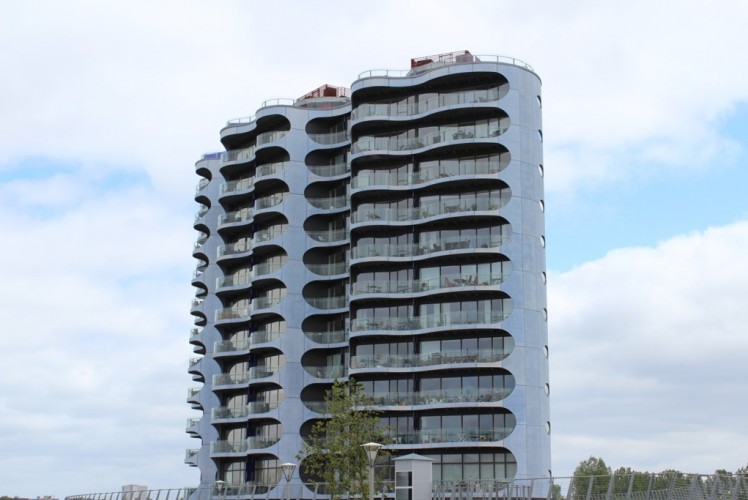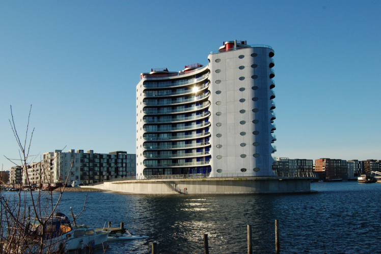 Metropolis, a landmark 11-story apartment building in Copenhagen’s Sluseholmen district, rises 45 meters high on a four-meter-tall artificial peninsula. Resembling a ship cutting through the harbor waters, the building takes inspiration from the visiting cruise liners, the harbor's former silos, and the copper towers of Knippels Bridge. Designed by a collaboration of English and Danish architects, Metropolis features a unique clover-like formation that makes it stand out as a futuristic icon on the waterfront.