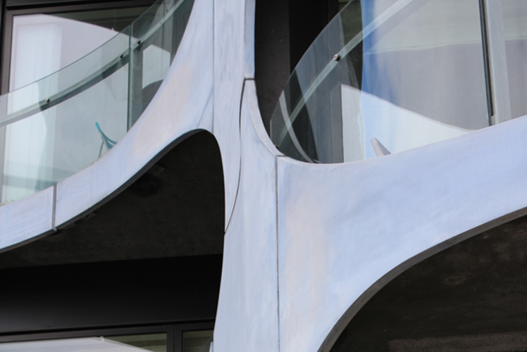 The façade’s striking blue color is achieved by adding marble powder to the GRC, creating a shimmering surface that develops a natural patina over time. The untreated surface reacts to weather conditions, darkening in rain and lightening when dry, giving it a dynamic, mussel-like appearance. The high whiteness of white cement enables GRC cladding to fully capture the architect’s vision when combined with selected pigments or aggregates. By choosing suitable frameworks, GRC proves to be a versatile solution allowing for complex shapes and intricate finishes while maintaining structural integrity.