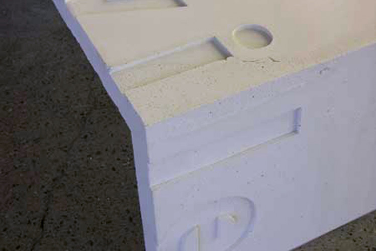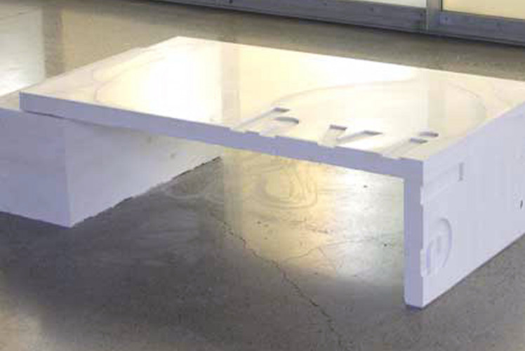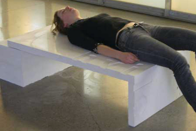The bench has two components. One is the surface on which you can lie and the other is the more massive structure on which this surface rests. This reflects the concept behind the bench of something light supported by something heavy. The reclined body lies on a surface which is as smooth as glass. It is actually a 6 mm thick glass sheet which is used as formwork. This creates a sharp interface where the two surfaces meet.