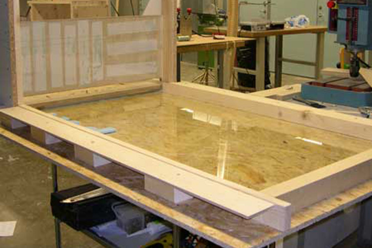 The bench is only 50 mm thick, but has a span of 1,200 mm. There are, inside, two layers of welded steel which forms a 3 mm untreated steel lattice of mesh size 30 mm.